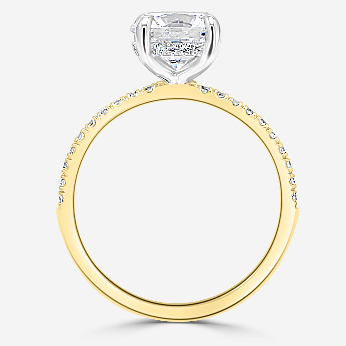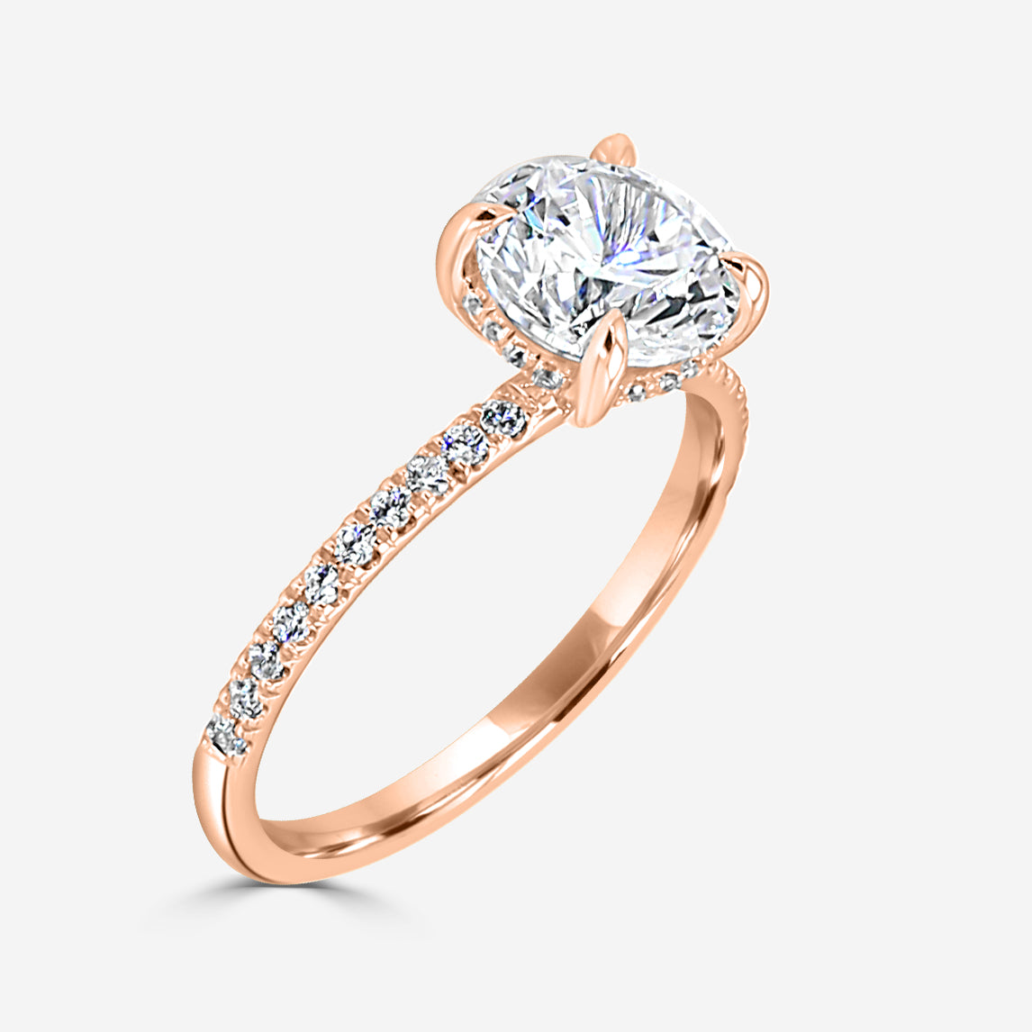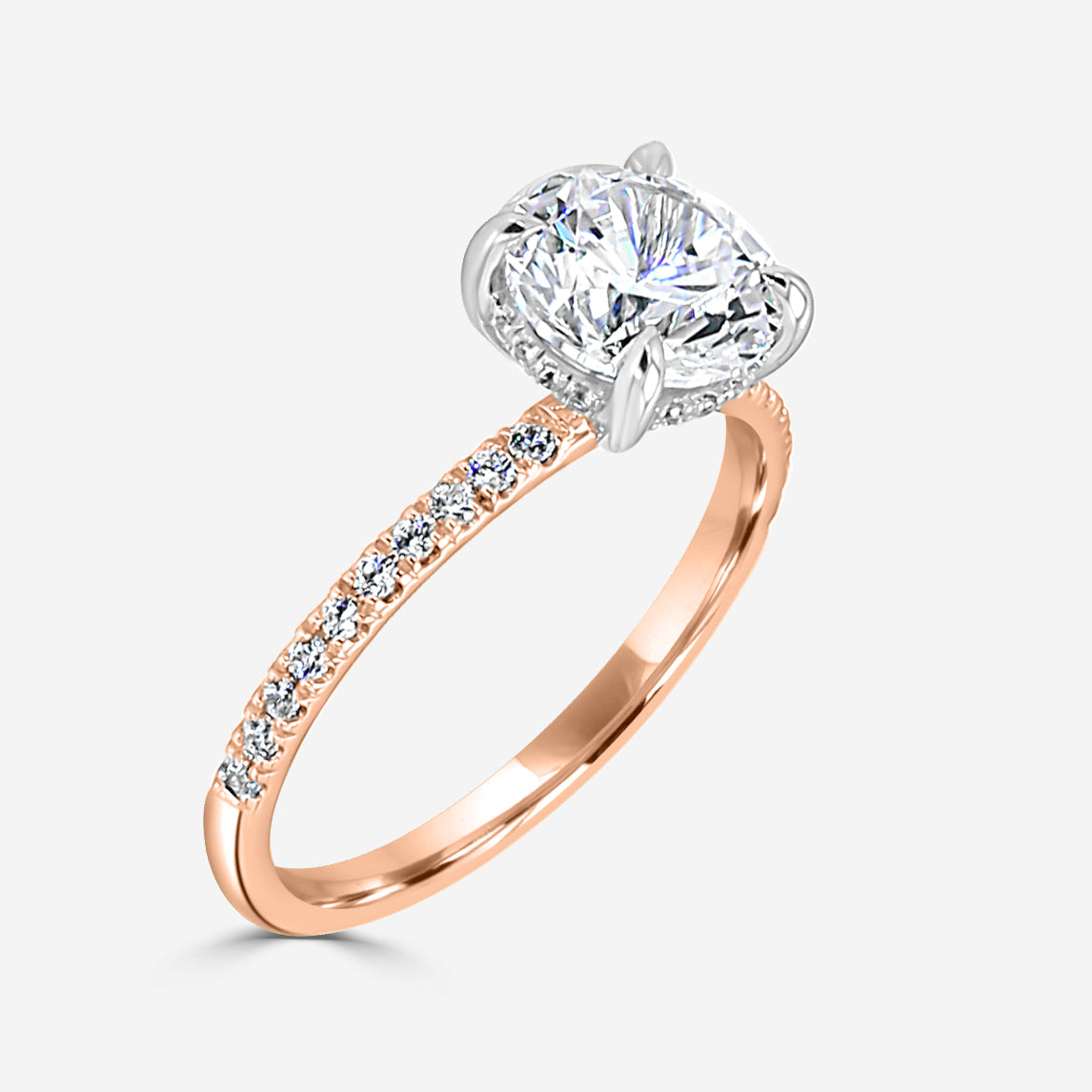 Engagement ring with a peg head, dia shank & a hidden halo. Center Diamond not included. Prices listed in 14K. 18K and Platinum metals also available. Engagement rings are available in various head sizes and shapes. Prices may vary.