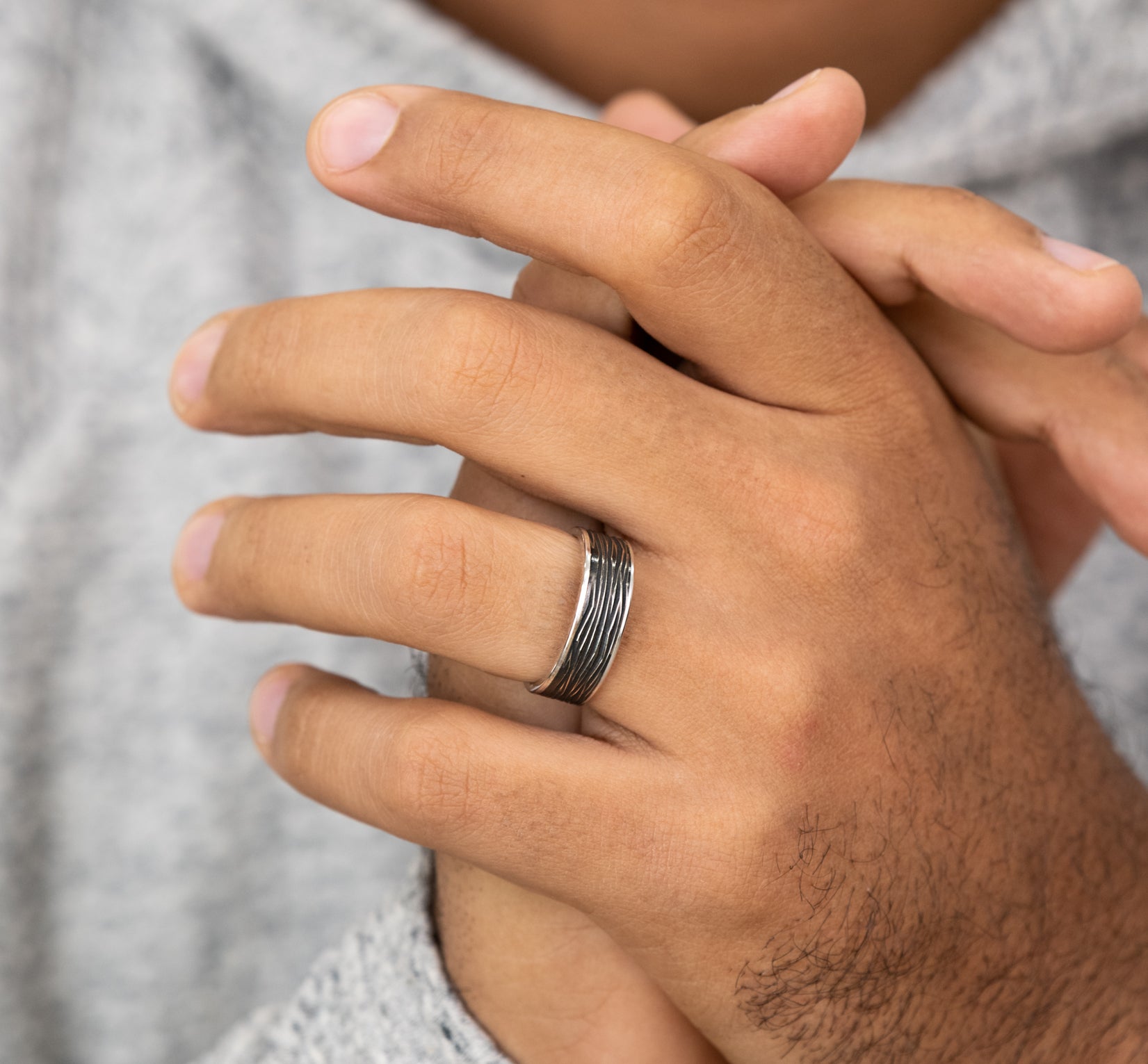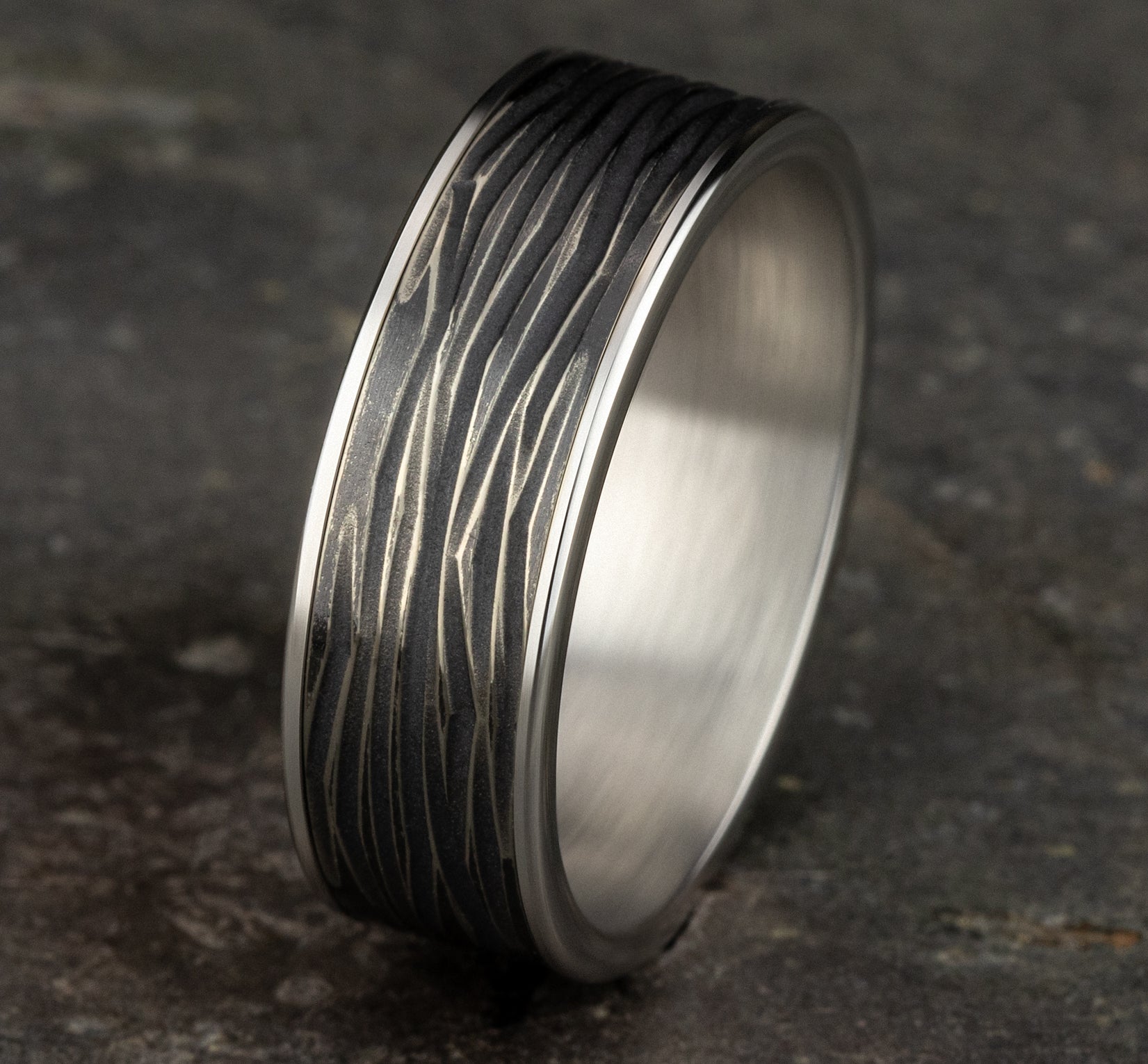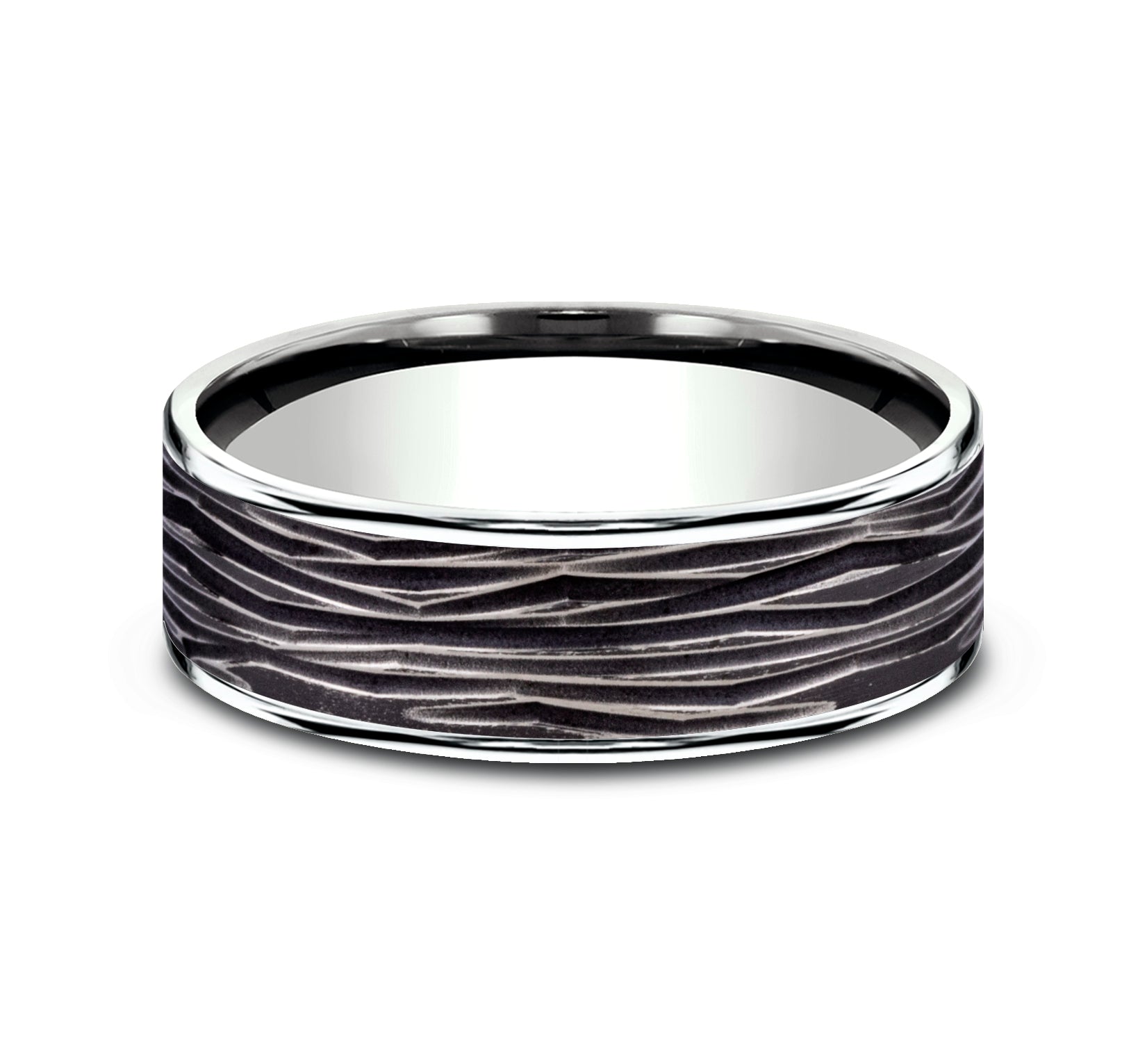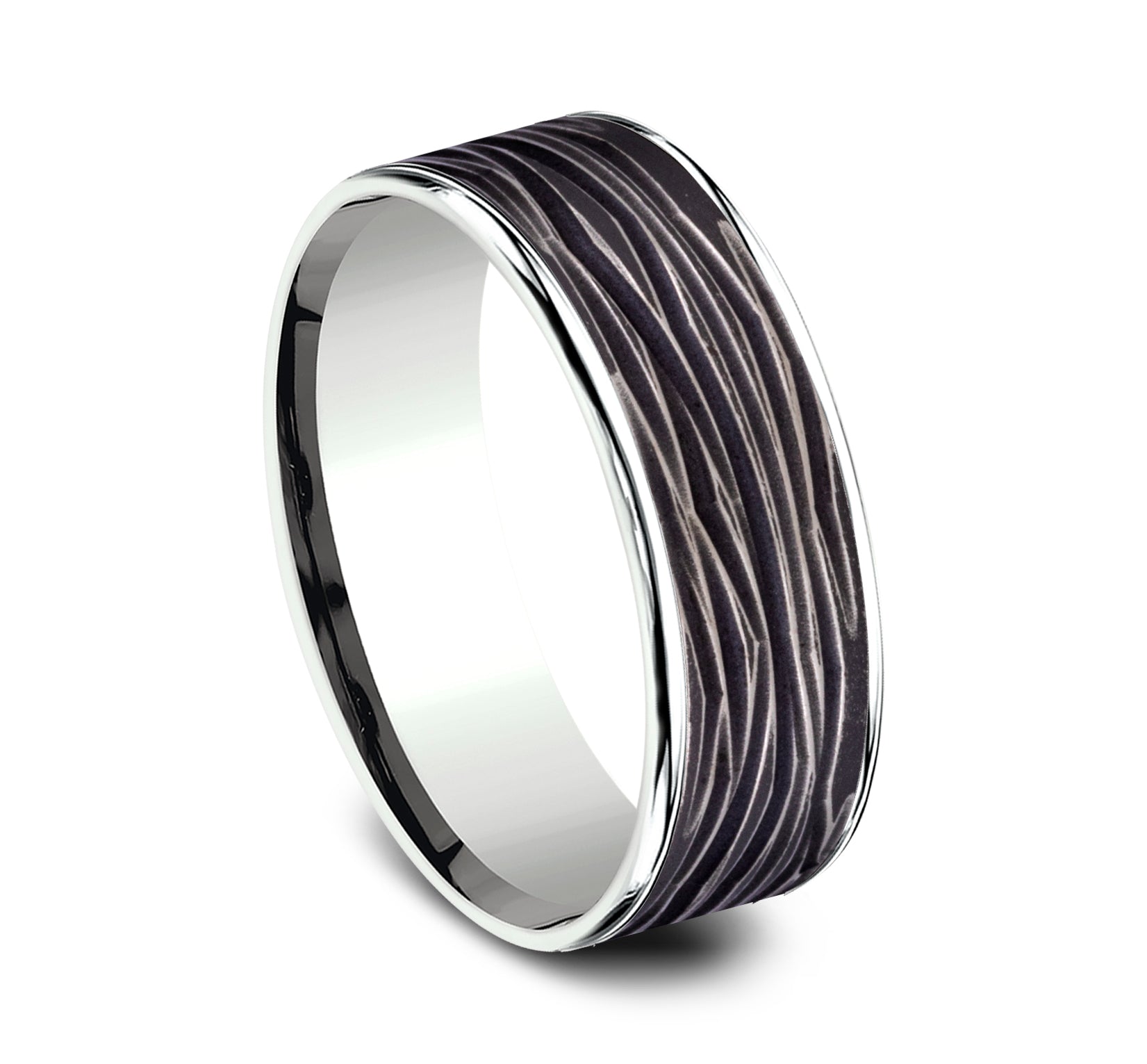 7.5mm, Comfort fit 14K White Gold and Black Titanium Horizontal bark patterned center, polished thin edges