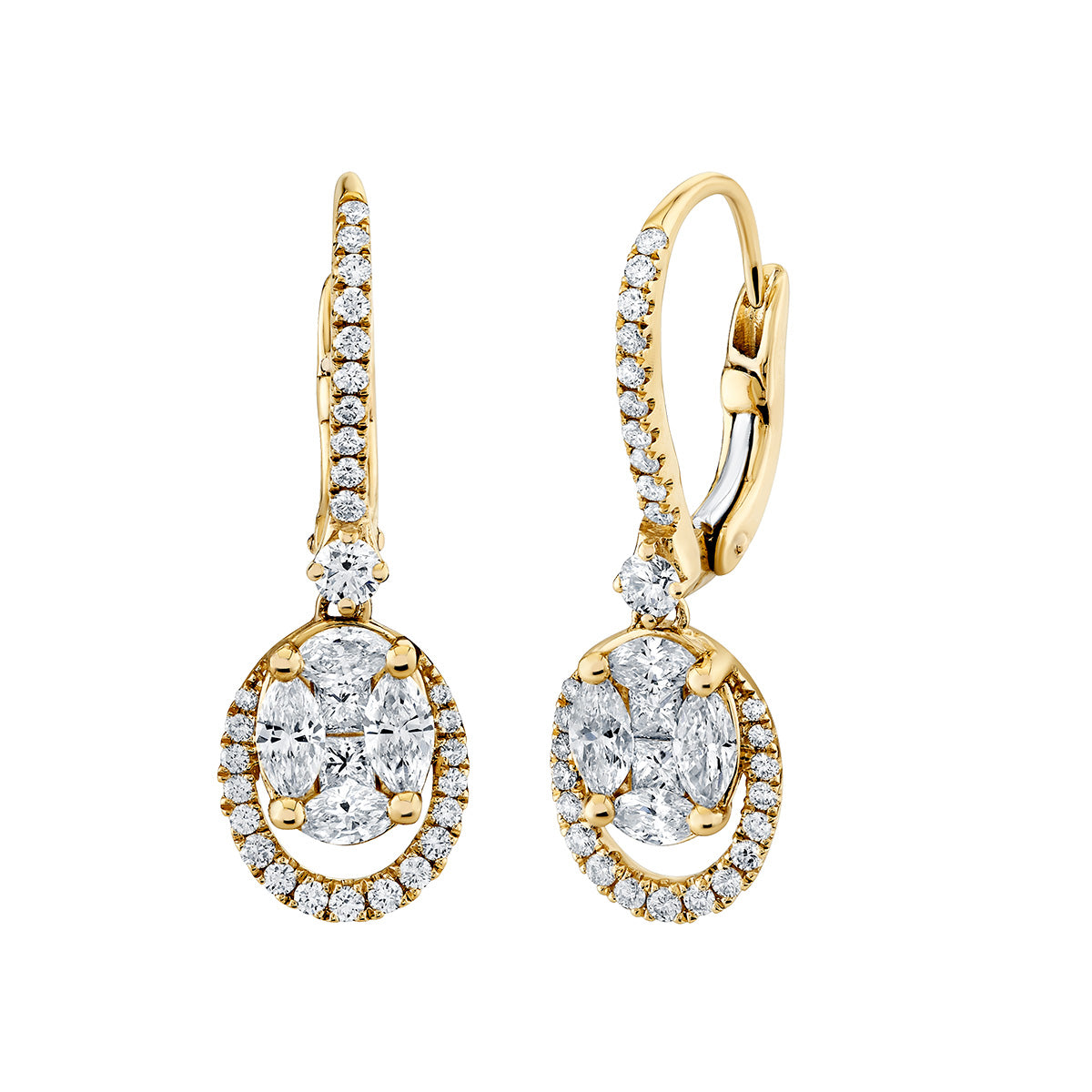 Yellow Gold Oval Diamond Halo Drop Earrings. Timeless diamond drop earrings featuring an oval center of clustered diamonds for maximum impact, framed by a brilliant pavé halo. Secured with a sophisticated leverback.