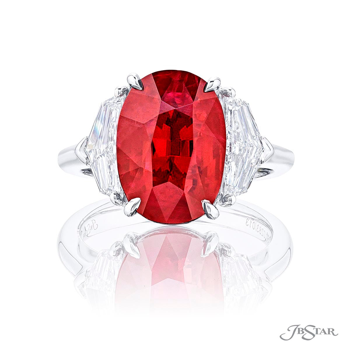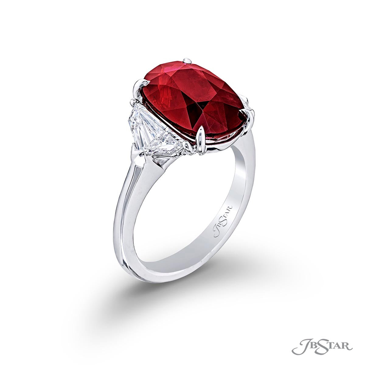 Stunning ruby and diamond ring featuring a 7.02 ct. certified shimmering cushion cut Burmese ruby embraced by epaulet diamonds. Handcrafted in pure platinum.