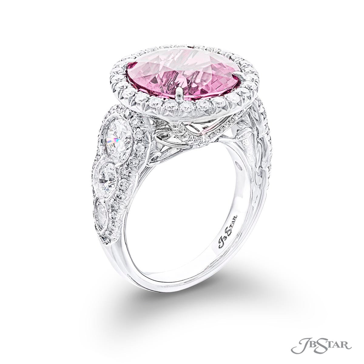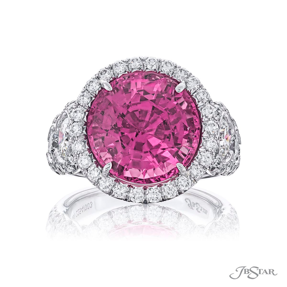 Dazzling pink spinel and diamond ring featuring a 9.04 ct. certified ""no-heat"" round pink spinel with cascading round and pear shaped diamonds in a micro pave setting. Handcrafted in pure platinum.