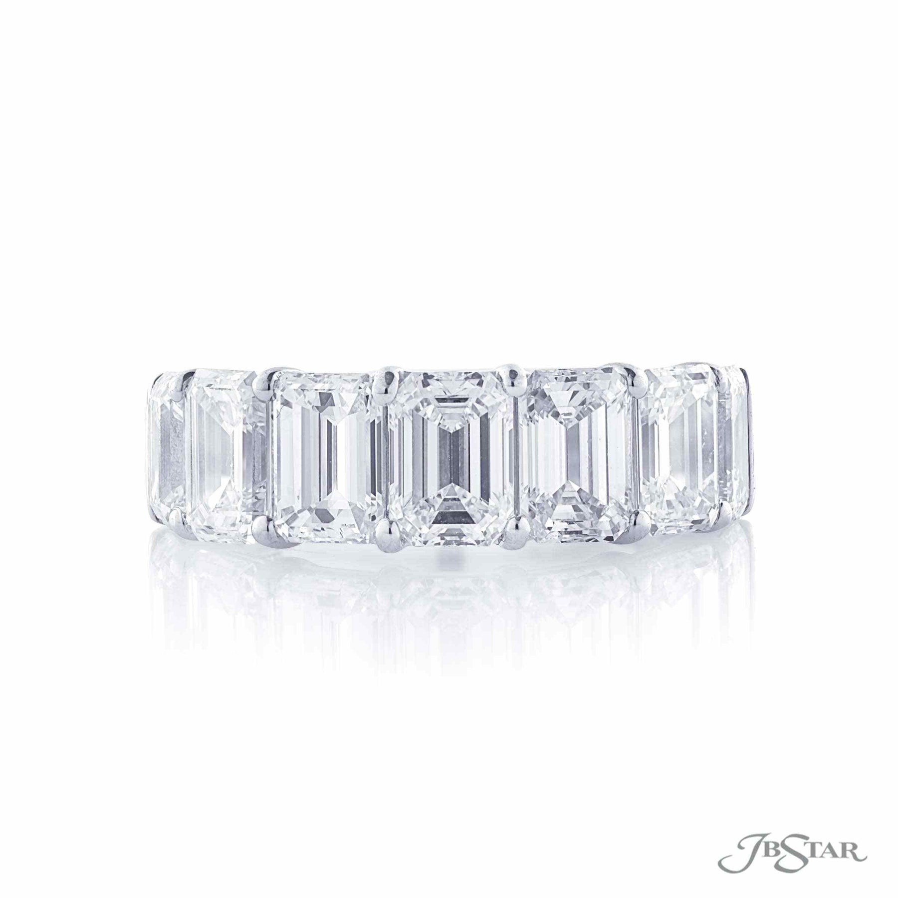 Stunning diamond wedding band featuring 7 emerald cut diamonds in a shared prong setting. Handcrafted in pure platinum.