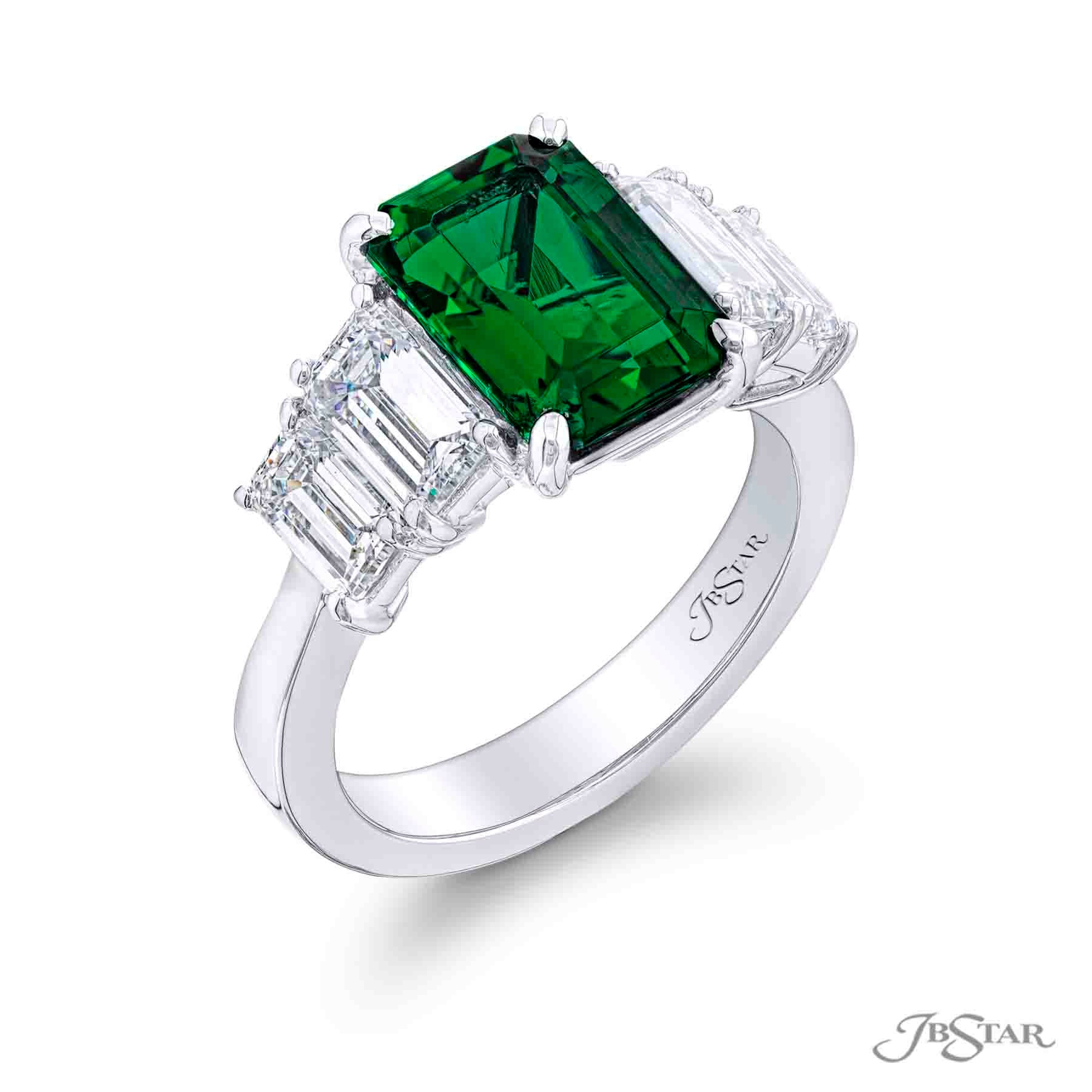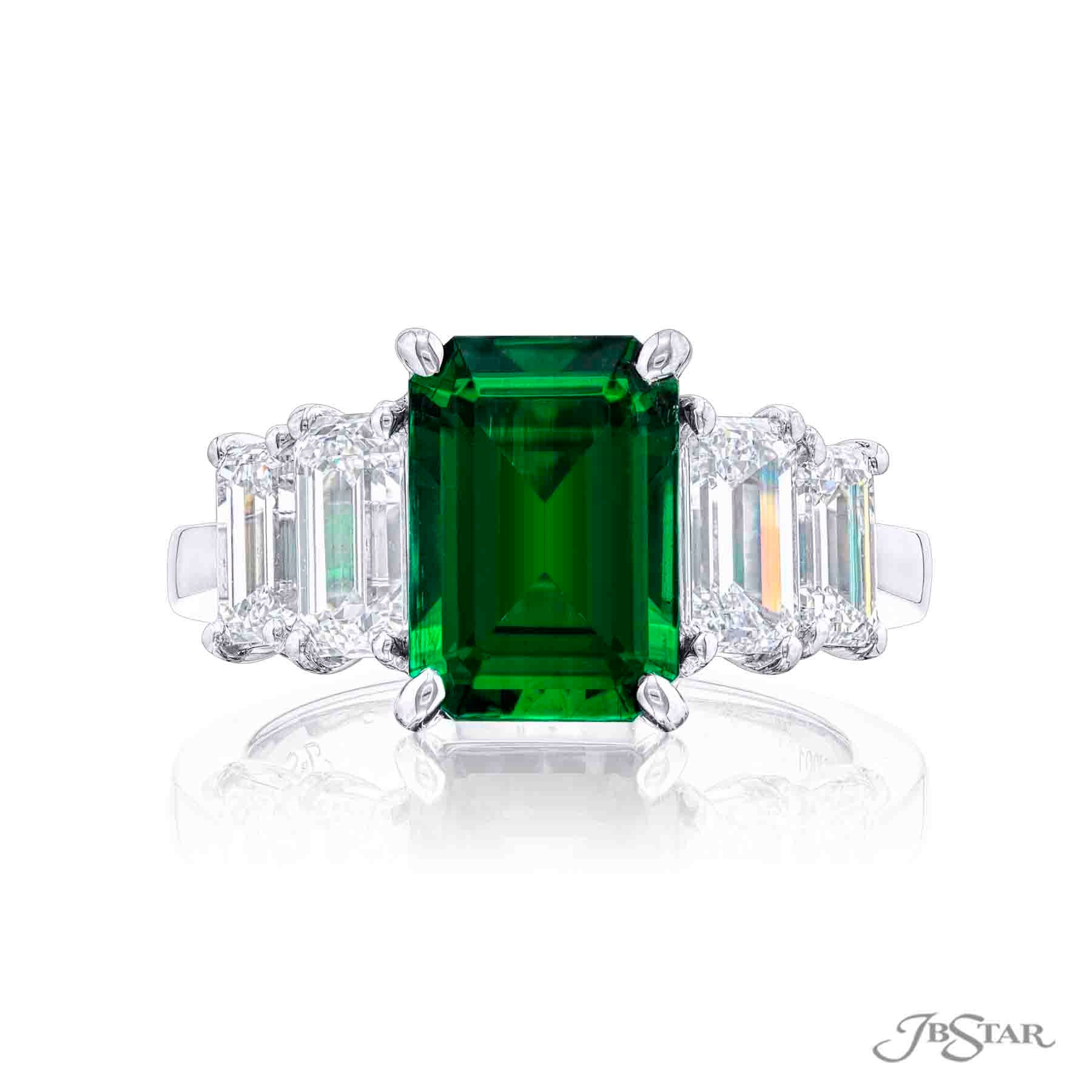 Dazzling emerald and diamond ring featuring a 2.49 ct. certified square emerald-cut emerald center embraced by 2 emerald cut diamonds in a shared prong setting. Handcrafted in pure platinum.