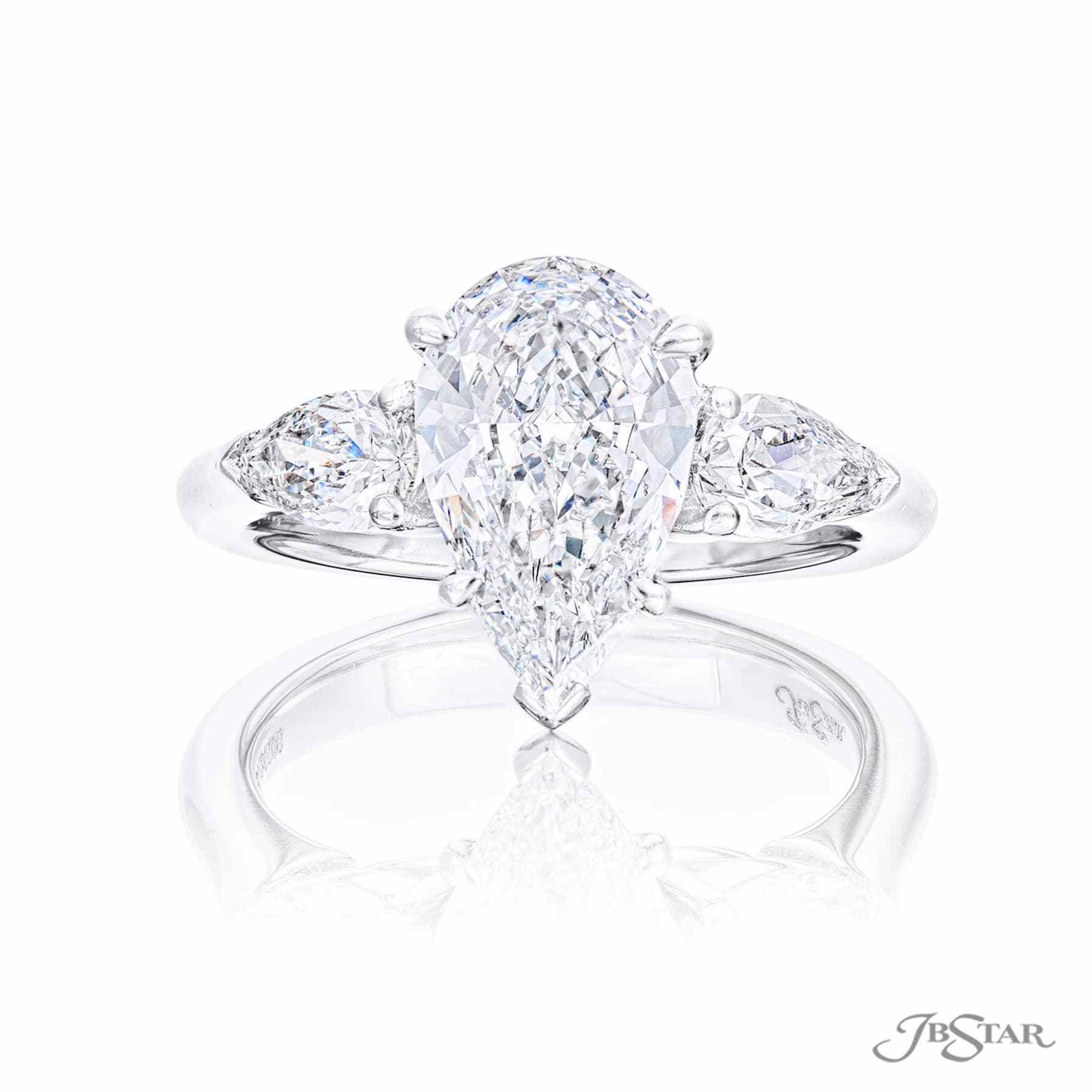Gorgeous diamond engagement ring featuring a 2.19 ct. GIA certified pear-shaped diamond center embraced by two additional pear shaped diamonds. Handcrafted in pure platinum.