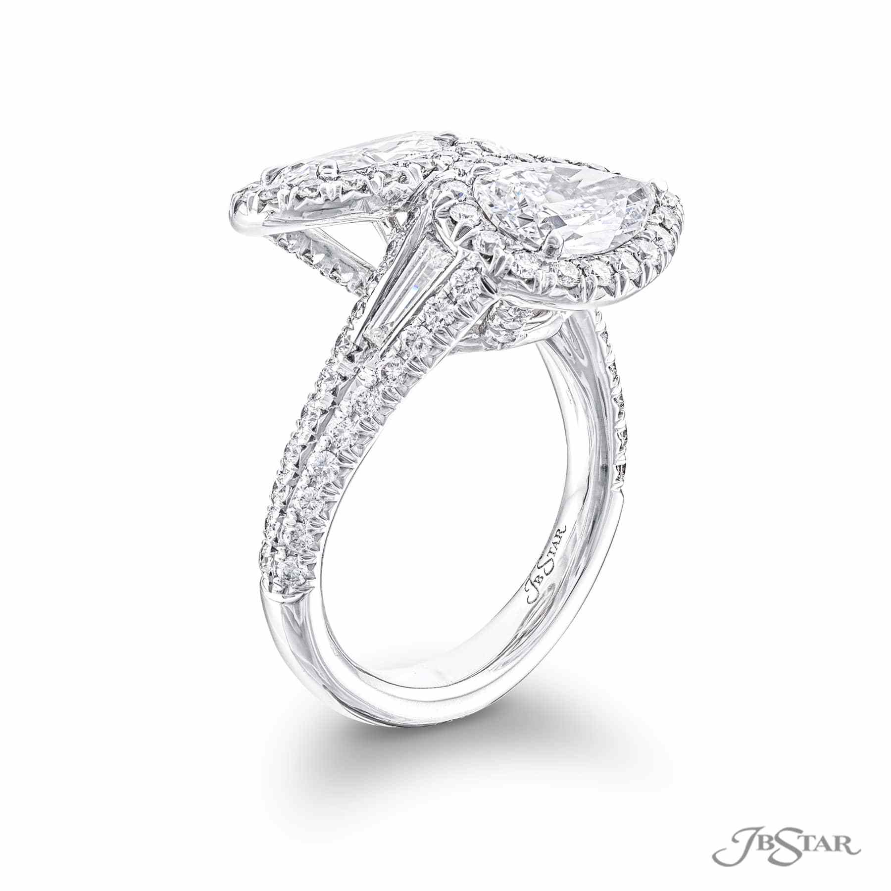 The stunning forever Twogether two stone ring featuring 1 pear shaped diamond and 1 oval diamond embracing each other in a micro pave bezel setting. Handcrafted in pure platinum.