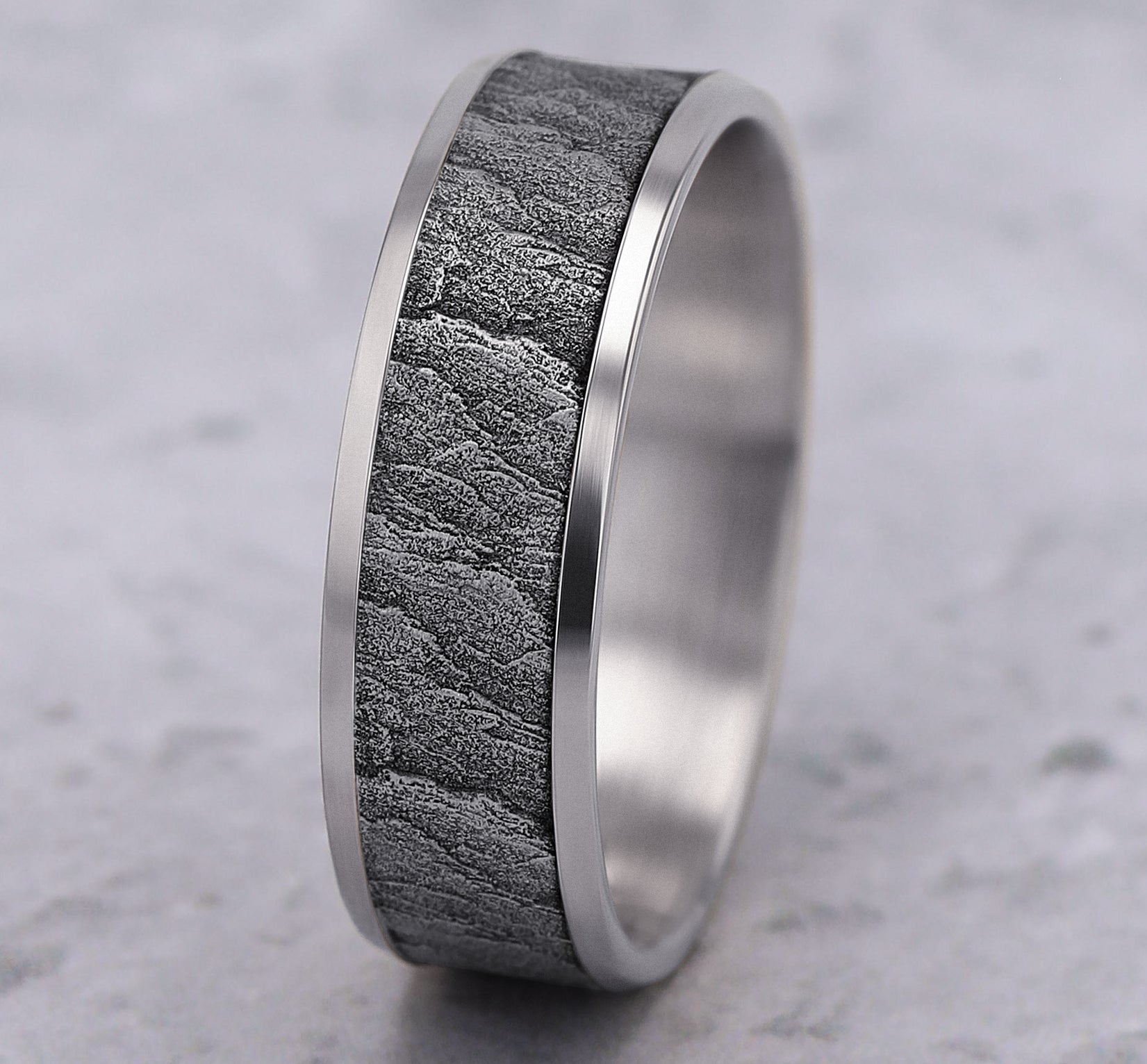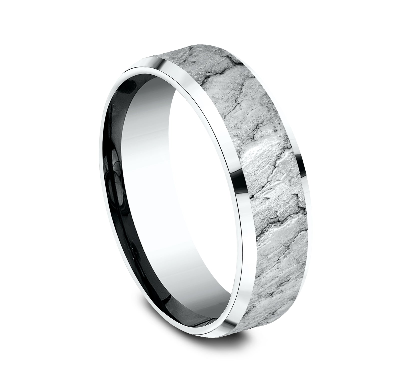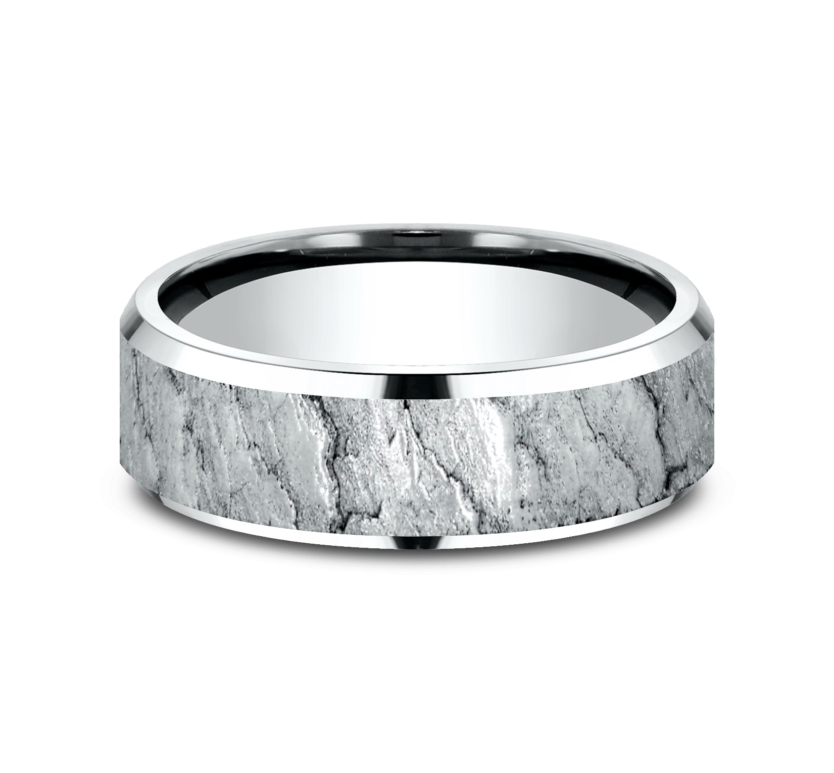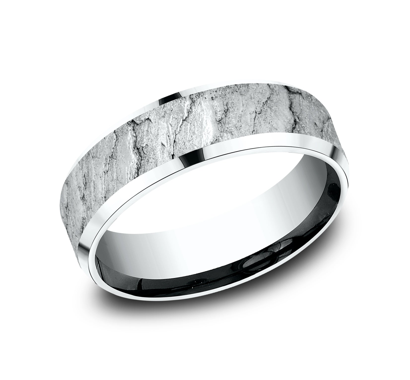 7mm, Lightweight comfort fit 14K White Gold Lava rock textured center, polished bevel edges