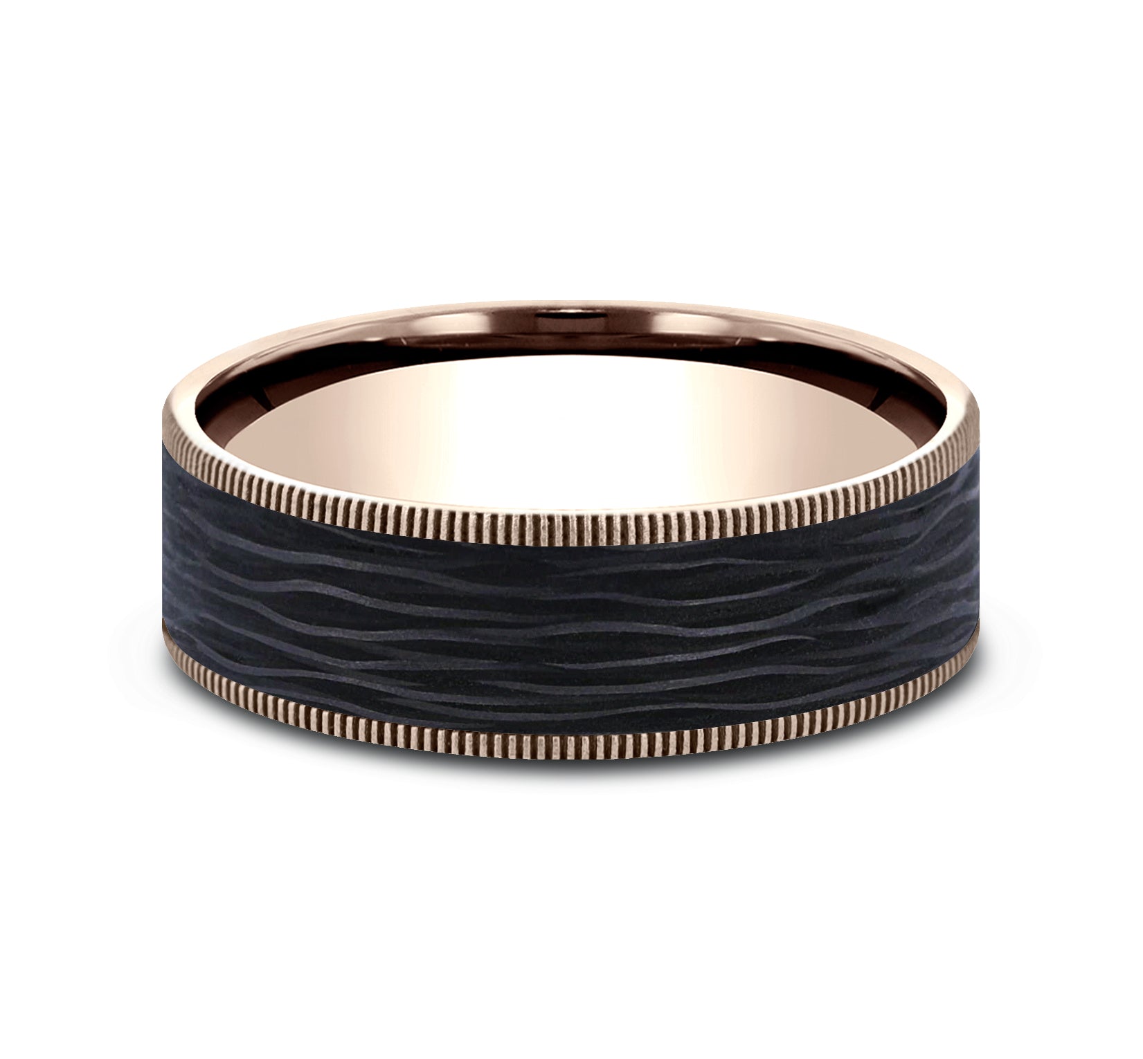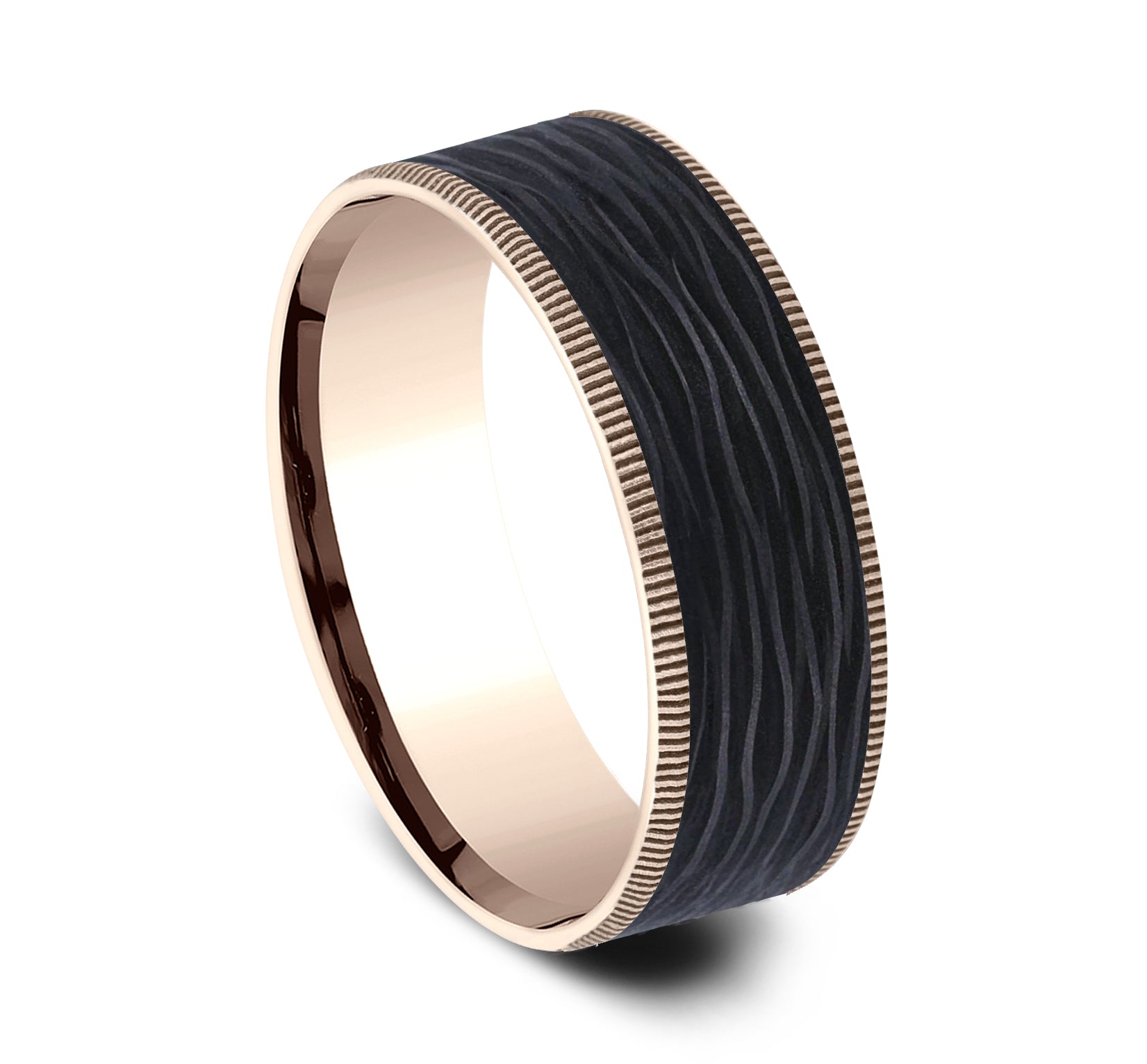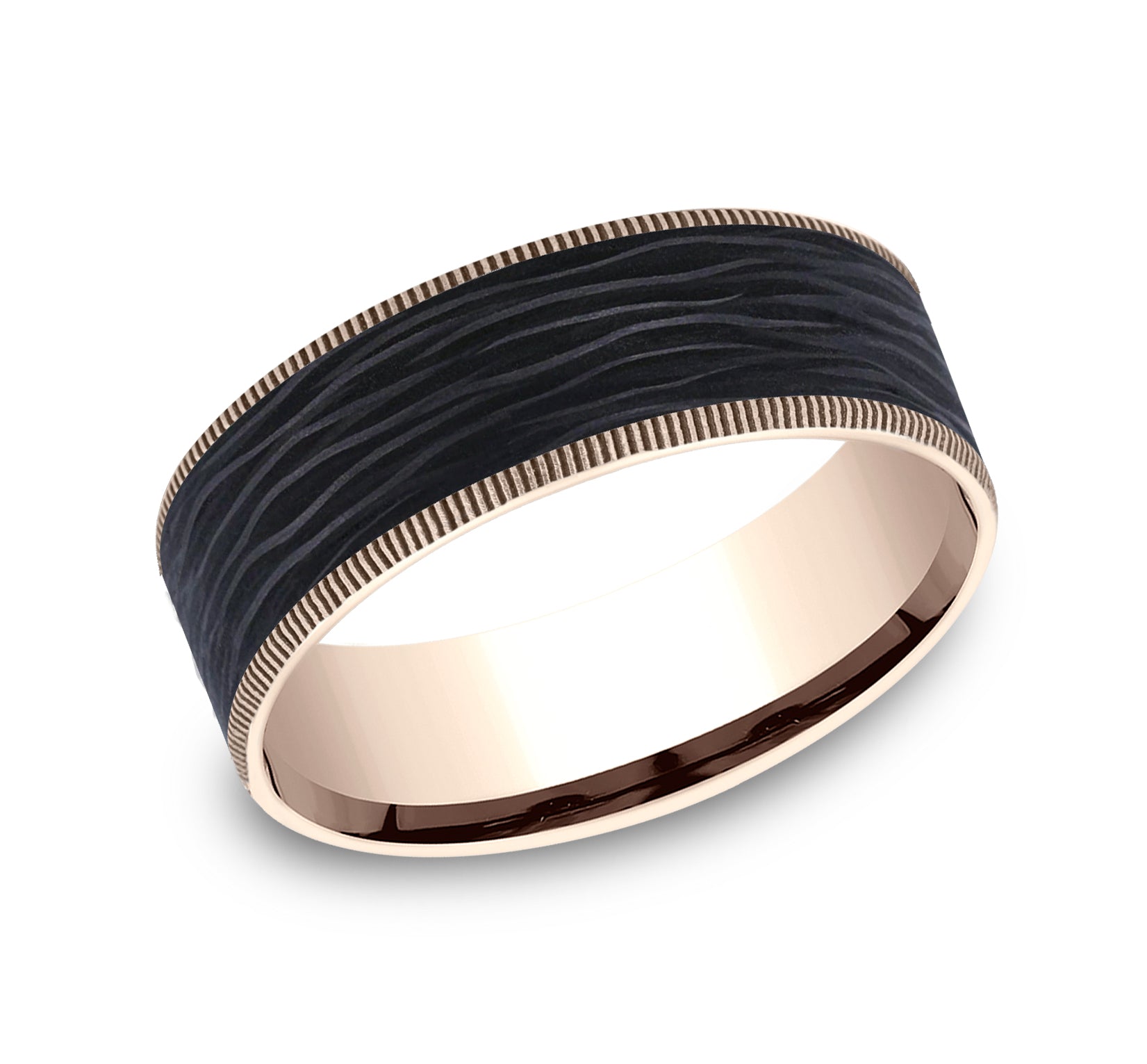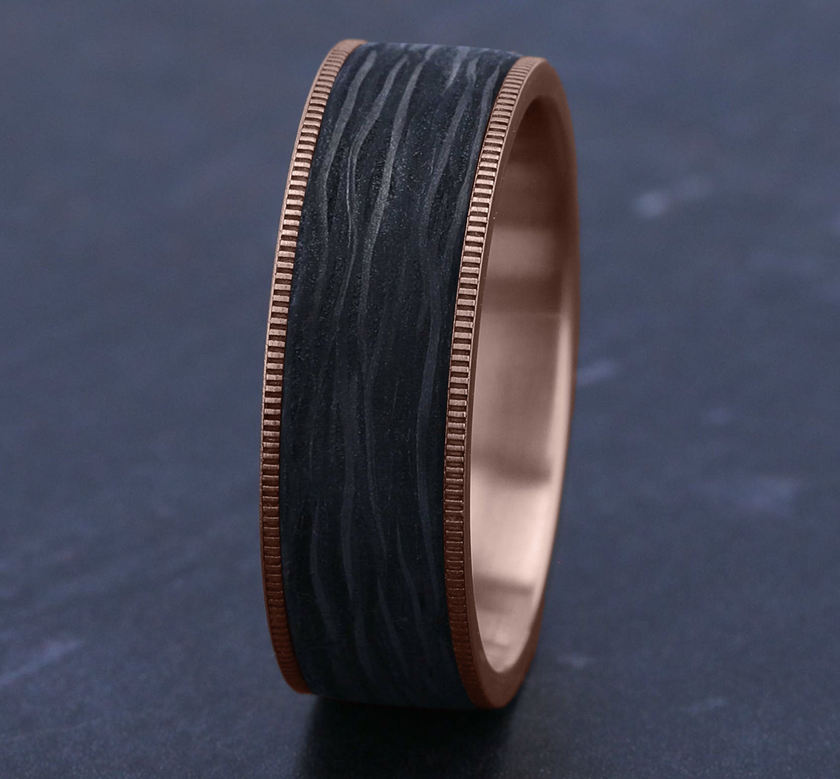 7.5mm, Comfort fit 14K Rose Gold and Forged Carbon Fiber Forged carbon fiber center, milgrain edges