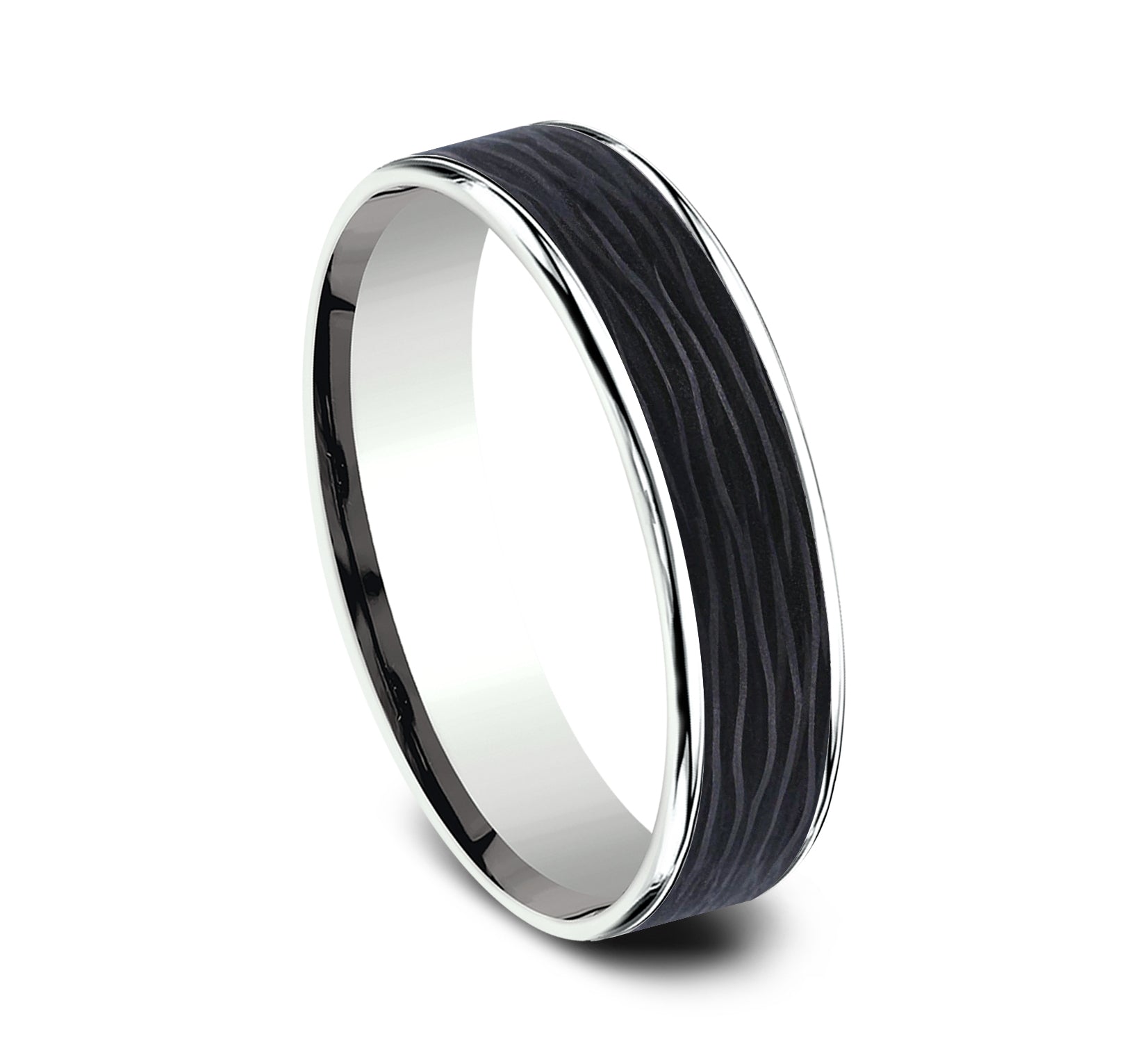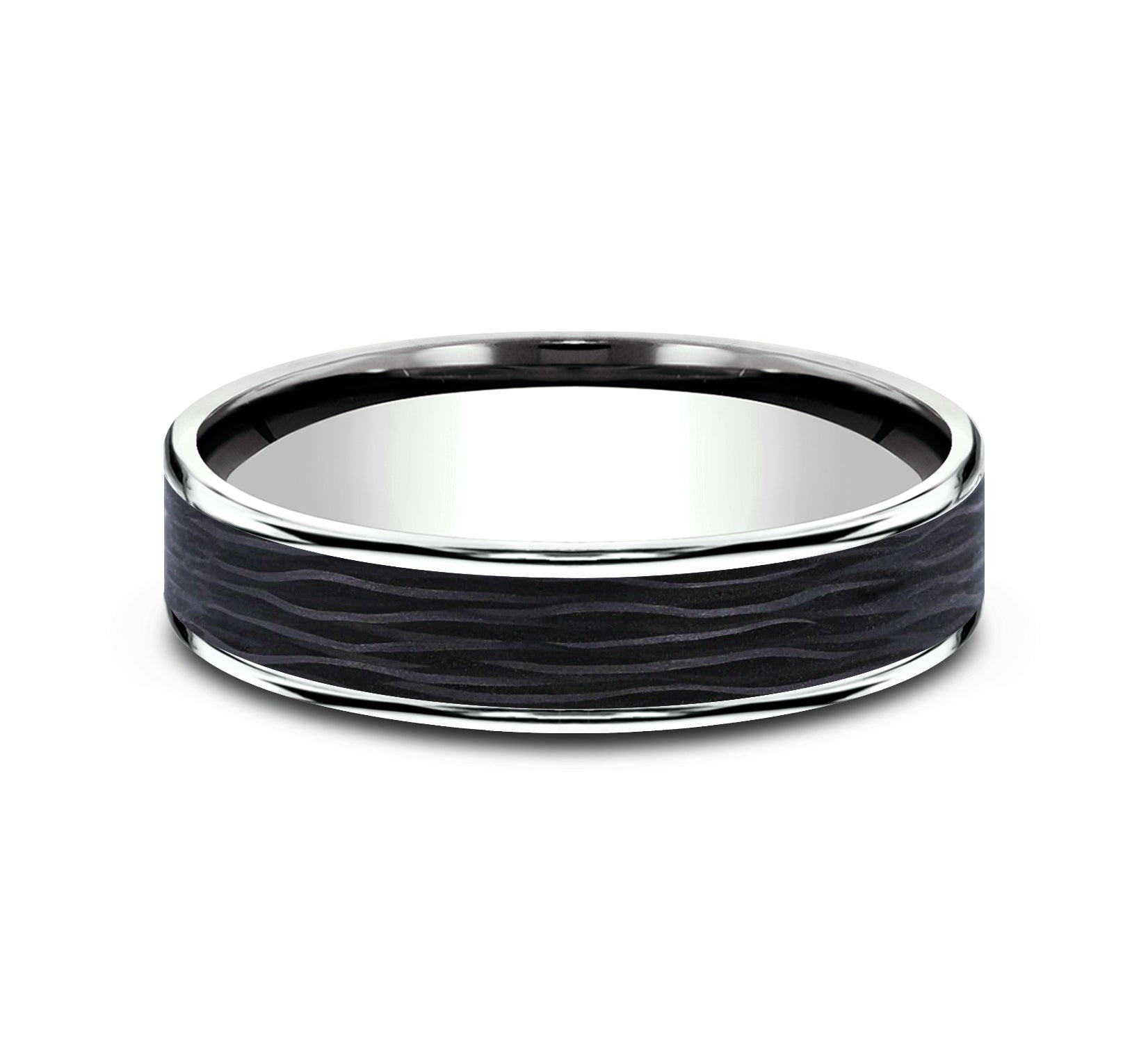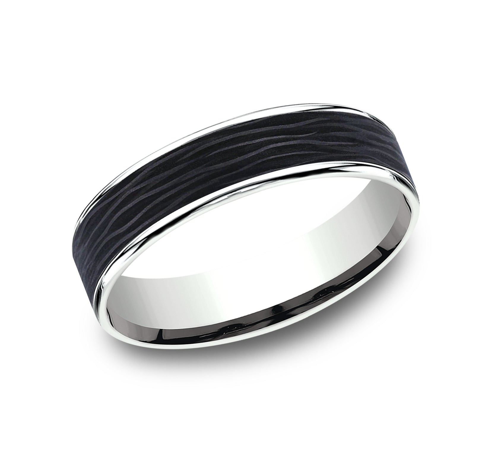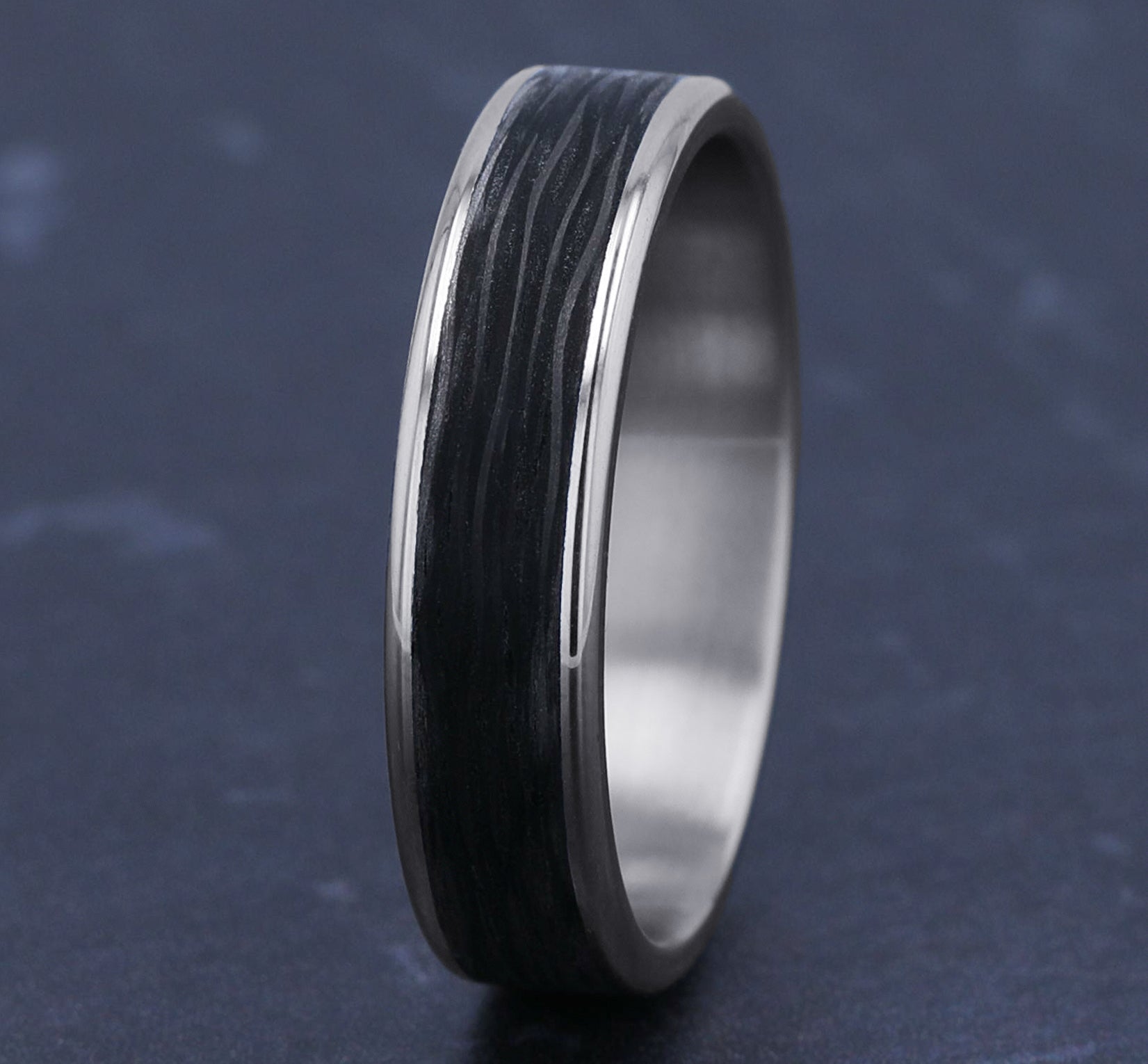 7.5mm, Comfort fit 14K Rose Gold and Forged Carbon Fiber Forged carbon fiber center, milgrain edges