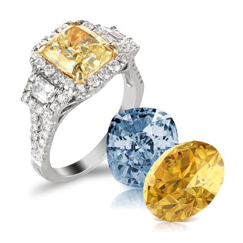 As the April birthstone, diamonds are the ideal gift for a loved one. And now you have more choices than ever. Get creative and give the ultimate gift of beauty: a fancy-color diamond. Fancy-color diamonds are natural, rare and truly exotic gem of the earth. Diamonds in hues of yellow, red, pink, blue, and green range in intensity from faint to vivid and generally the more saturated the color, the higher the value. In fact, diamonds sparkling with intense color are rare and may be priced higher than a colorless diamond of equal size. Because fancy-color diamonds are very desirable, color is sometimes introduced in a laboratory. These are correctly called color-treated diamonds. When purchasing a fancy-color diamond, the shopper should ask if any enhancements or treatments were used to improve its color and/or clarity.
