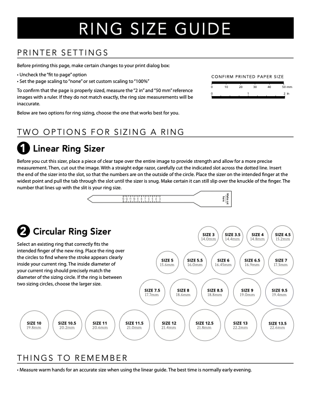 The Ring Size Guide can help you determine the size of a ring that is already being worn on the same finger. Simply print out the Guide and start trying the ring on each circle until you find the one that fits perfectly on the inner side of the ring.